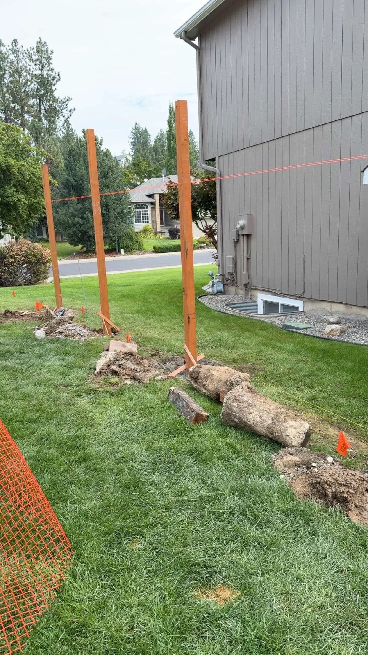 Construction site in a yard with orange wooden posts, leaning rocks, and orange safety fencing, next to a gray house with a small basement window.