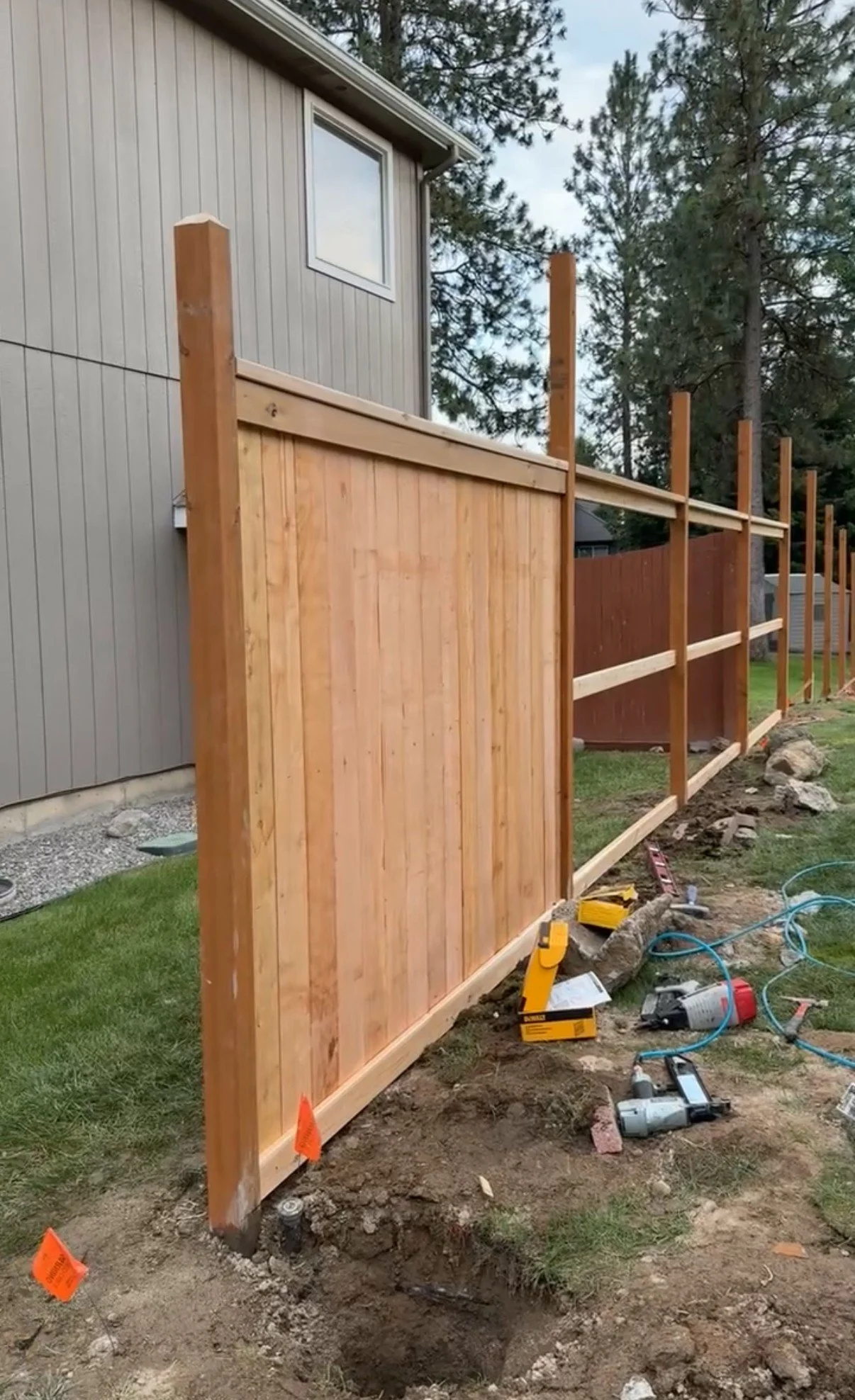 Wooden fence under construction next to a residential house, with tools and equipment on the ground.